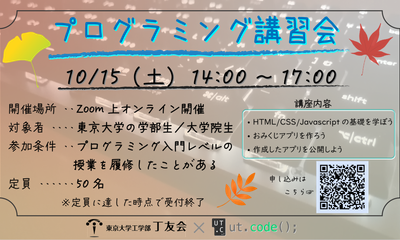 ut.code(); は工学部丁友会と合同で、東京大学の学部生および大学院生を対象にプログラミング講習会を以下の通り実施いたします。 概要 HTML・CSS...